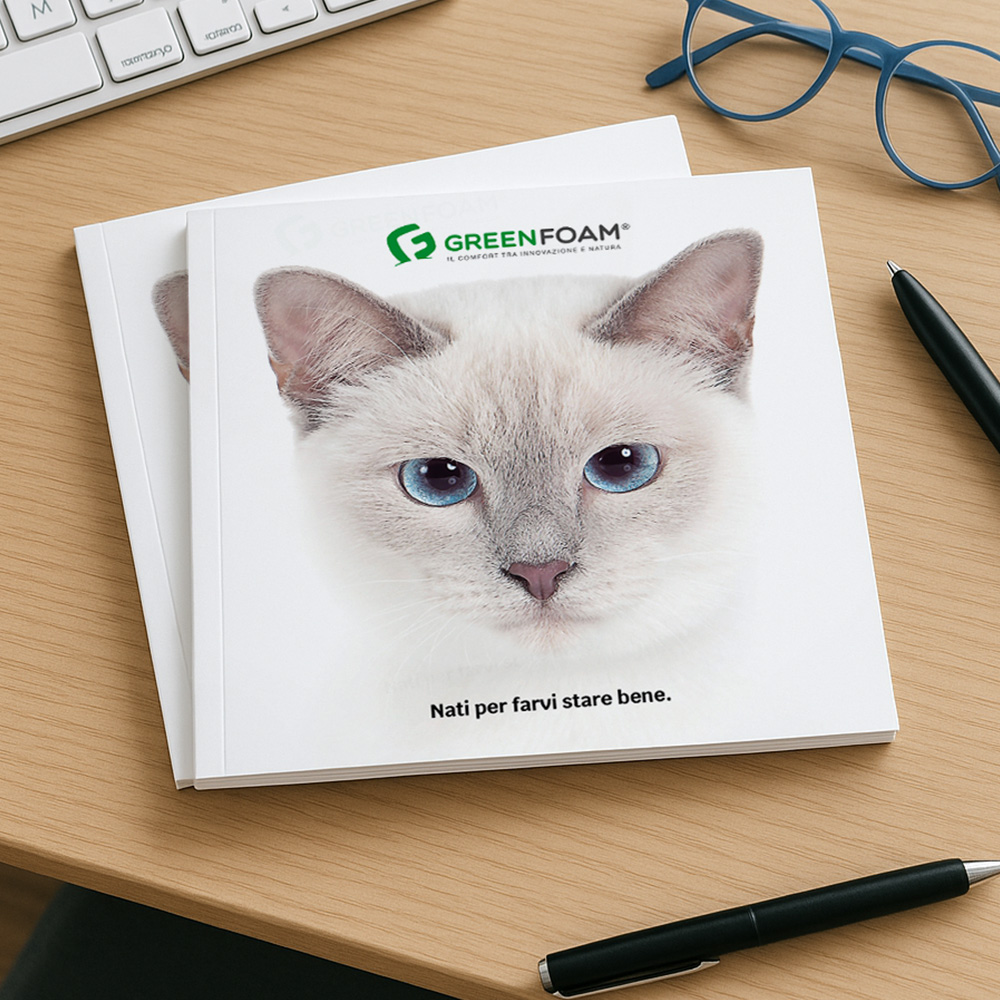 Nasce una brochure dal design funzionale che si trasforma in una vera e propria cartellina-contenitore, pensata per custodire e raccontare la storia di Green Foam in modo ordinato e d’impatto.